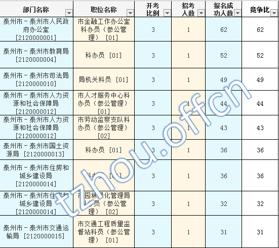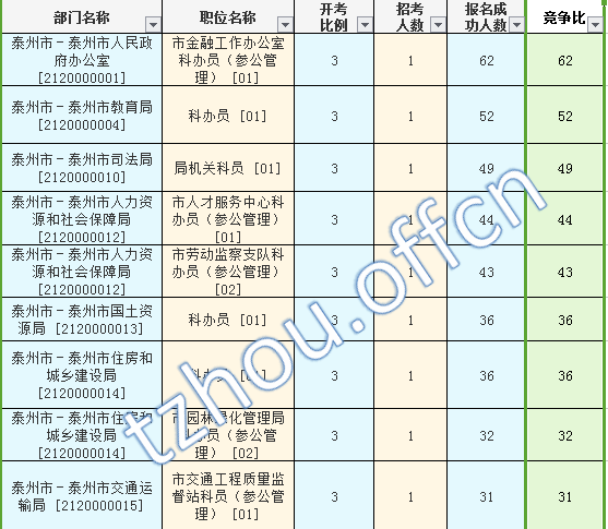 截至14日16時,泰州城市報名人數最多的職位為:市金融工作辦公室科辦員(參公管理) [01],一共有62人報名,競爭最激烈的職位為泰州市-泰州市人民政府辦公室 [2120000001]市金融工作辦公室科辦員(參公管理) [01],招錄1人,報名人數為62人,報名通過審核人數前十的職位主要集中在泰州市-泰州市人民政府辦公室 [2120000001]、泰州市-泰州市教育局 [2120000004]]、泰州市-泰州市司法局 [2120000010],具體信息如下: