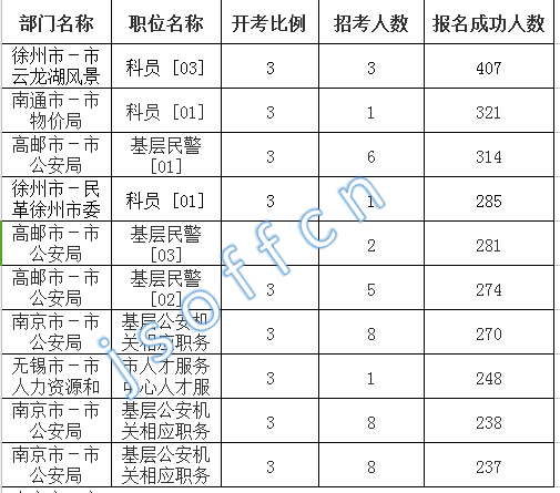 截至16日16時,江蘇省報名人數最多的職位為:徐州市-市云龍湖風景名勝區行政執法大隊(參公管理) [2030000101]、科員 [03],一共有407人報名,競爭最激烈的職位為南通市-市物價局 [2060000048] 、科員 [01],招錄1人,報名人數為321人,報名通過審核人數前十的職位主要集中在南京市公安局、南通市物價局、高郵市-市公安局等部門,具體信息如下: 江蘇省報名人數最多十大崗位