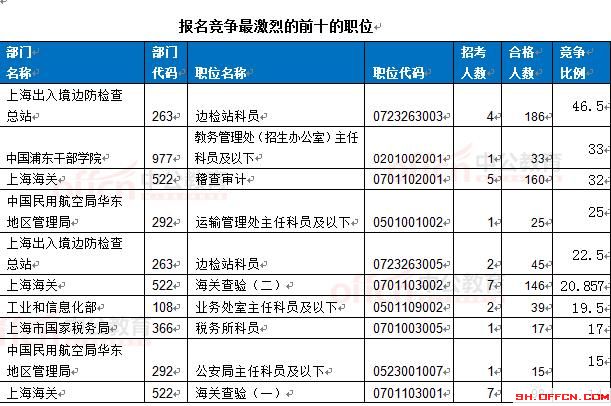 報(bào)名通過審核人數(shù)前十的職位主要集中在上海出入境邊防檢查總站、上海海關(guān)、工業(yè)和信息化部等部門,具體信息如下: