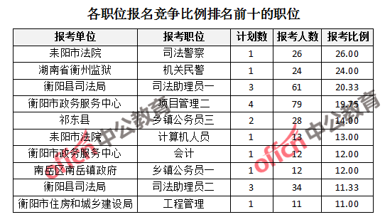 競爭熱門職位,前三位依次是:耒陽市法院司法警察(競爭比例26:1)、湖南省衡州監獄機關民警(競爭比例24:1)和衡陽縣司法局司法助理員一(競爭比例20.33:1)。