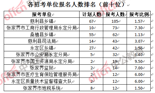競爭熱門招考單位,前三位依次是:張家界市森林公安局八大公山自然保護(hù)區(qū)大隊(競爭比例11:1)、張家界市國土資源局永定分局(競爭比例9.5:1)和張家界市工商行政管理局永定分局(競爭比例7.3:1)。