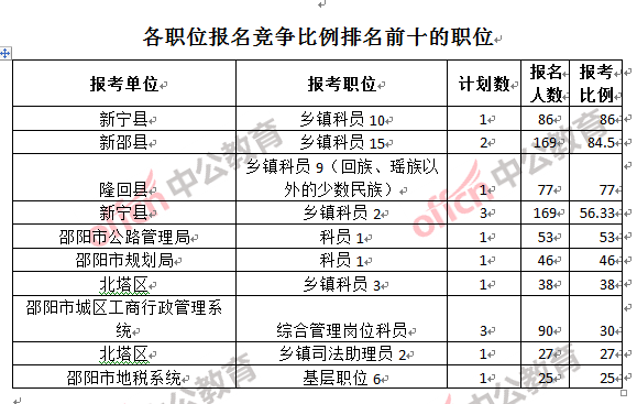 競爭熱門職位,前三位依次是:新寧縣鄉鎮科員10(競爭比例86:1)、新邵縣鄉鎮科員15(競爭比例84.5:1)和隆回縣 鄉鎮科員9(回族、瑤族以外的少數民族)(競爭比例77:1)。