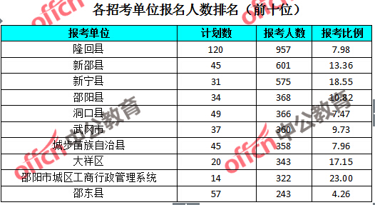 為幫助廣大考生更清晰的了解報名情況,中公教育整理了湖南邵陽各招考單位的報名人數排名以及競爭比例排名,供廣大考生參考: