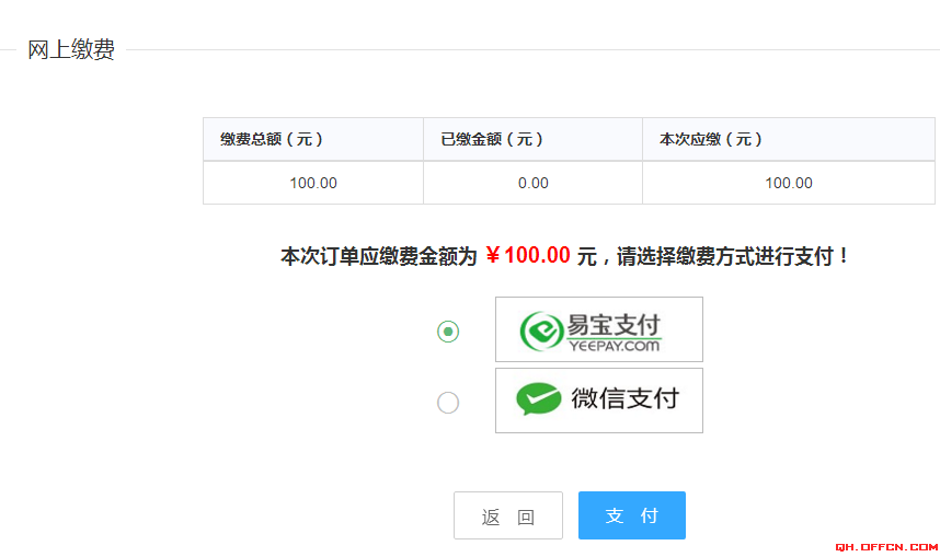 (三)照片審核需要時間,審核通過后,就會進入網上繳費入口,有兩種支付方式,易寶支付和微信支付,本次國考兩門,行測和申論,考試費用100。