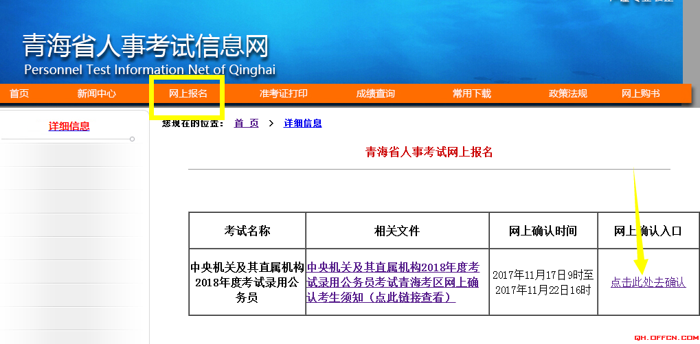 (一)在青海人事考試信息網里的網上報名入口進入,有2018國考的網上確認入口點擊確認。在登錄頁面,需要填寫報名序號,此序號在之前國考的報名專題里,報考信息下面就有。