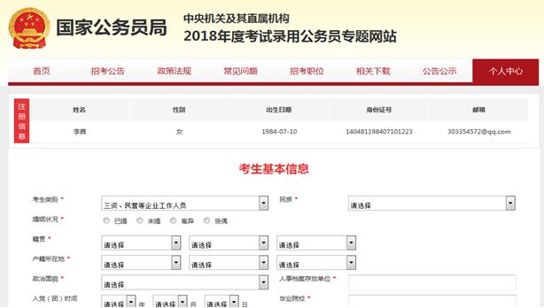 考生可以在注冊完成之后立馬去完善個人信息,也可以在選報之后去完善個人信息,考生填寫基本信息的界面如下: