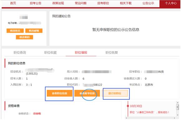 在這個界面,點擊“查看職位信息”看職位的詳細信息,點擊“查看報考信息”可以看到自己的詳細個人信息,如果對這個職位反悔的話則可以“退訂該職位”,然后再重新選擇。