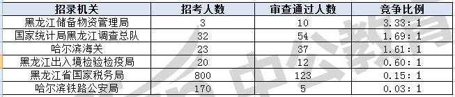 截止到30日18時,通過審核人數前三位的部門依次是:黑龍江省國家稅務局、國家統計局黑龍江調查總隊、哈爾濱海關,三部門通過審核總人數達214人,占通過審核總人數的88.8%。