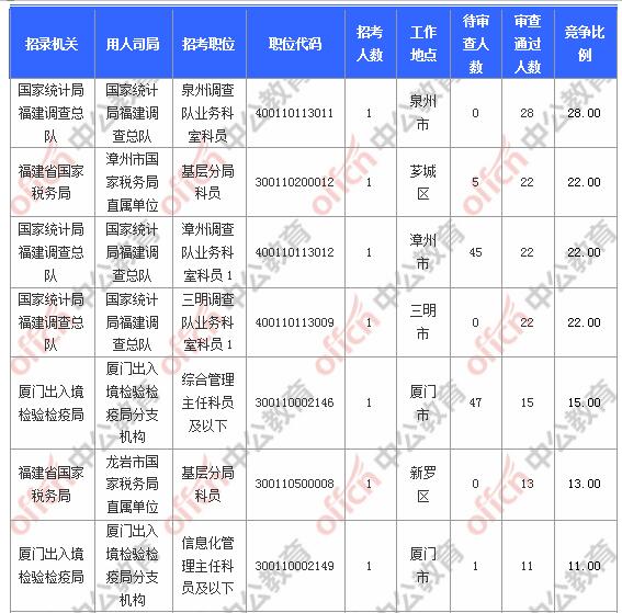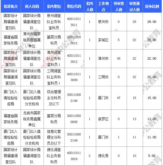 報名通過審核人數前十的職位主要集中在國家統計局福建調查總隊、福建省國家稅務局、廈門出入境檢驗檢疫局等部門,具體信息如下: