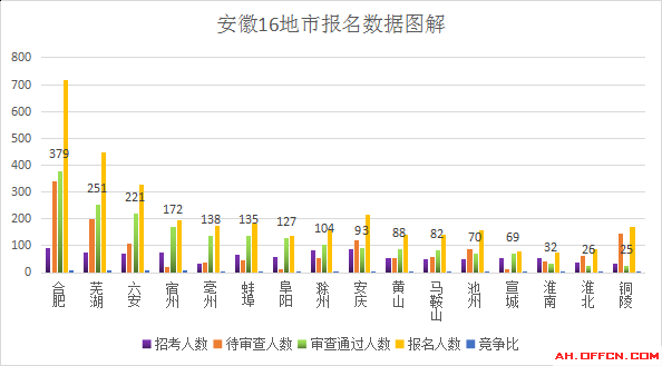 截止到31日18時,安徽地區16個地市通過審核的人數如下,其中合肥市通過審核人數最多;為379人,銅陵市通過審核人數最少,為25人。合肥市的競爭最激烈,為4.08:1。