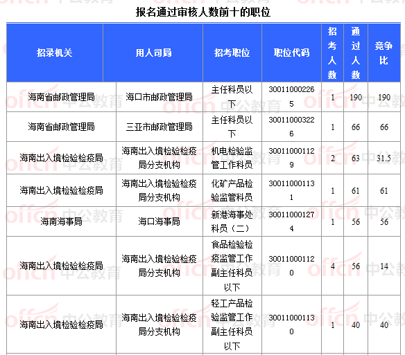 報名通過審核人數前十的職位主要集中在海南省郵政管理局、海南出入境檢驗檢疫局、海南海事局等部門,具體信息如下:
