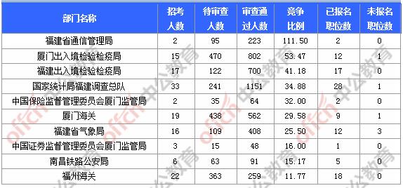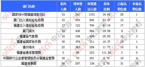 截止到3日9時,通過審核人數前三位的部門依次是:國家統計局福建調查總隊、廈門出入境檢驗檢疫局、福建出入境檢驗檢疫局,三部門通過審核總人數達2653人,占通過審核總人數的52.79%。