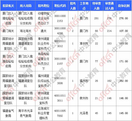 報名通過審核人數(shù)前十的職位主要集中在廈門出入境檢驗檢疫局、廈門海關(guān)、國家統(tǒng)計局福建調(diào)查總隊,具體信息如下: