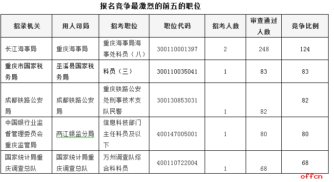 報名通過審核人數前五的職位主要集中在中國銀行業監督管理委員會重慶監管局、長江海事局、重慶市國家稅務局等部門,具體信息如下:
