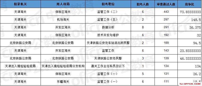 報名通過審核人數(shù)前十的職位主要集中在天津海關(guān)、北京鐵路公安局、天津出入境檢驗檢疫局等部門,具體信息如下: