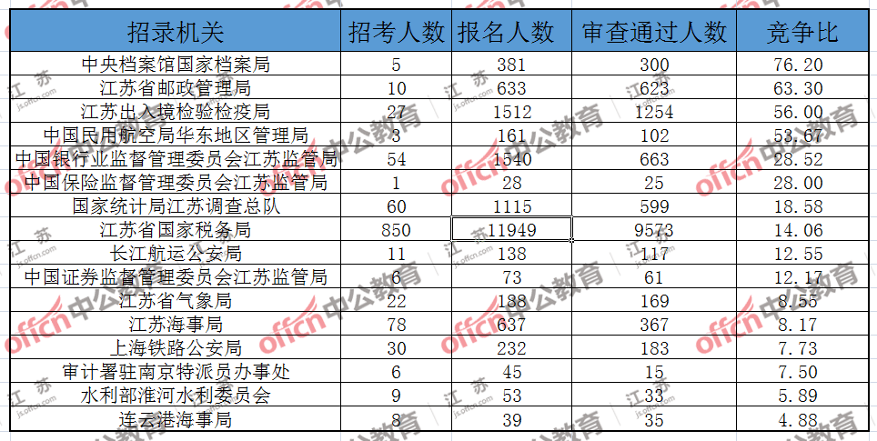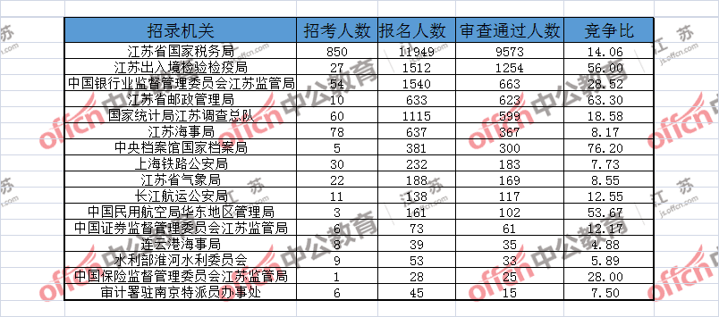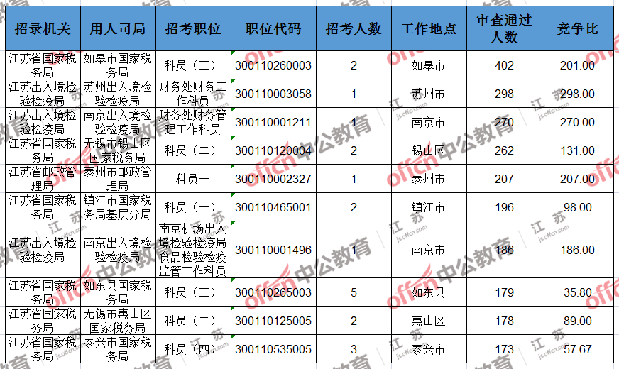 報(bào)名通過(guò)審核人數(shù)前十的職位主要集中在江蘇出入境檢驗(yàn)檢疫局、江蘇省郵政管理局、江蘇省國(guó)家稅務(wù)局等部門(mén),具體信息如下: