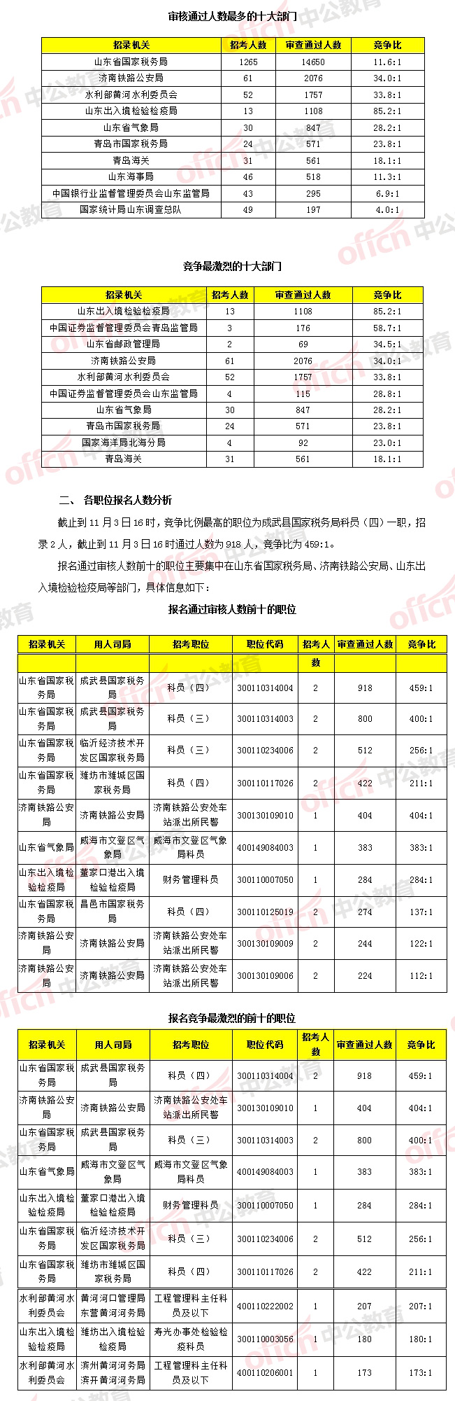[3日16時]2018國考報名數(shù)據(jù):山東23499人過審 最熱職位高達459:1 無人報考職位仍有43個