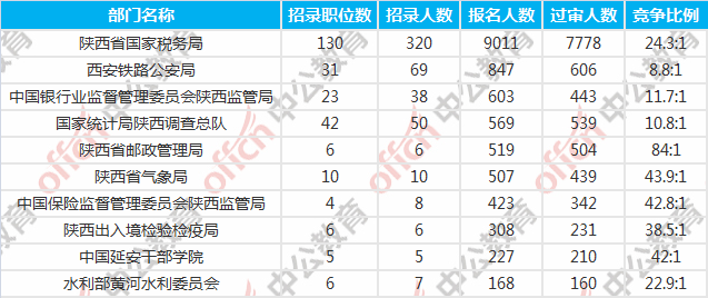 截至到4日9時,通過審核人數前三位的部門依次是:陜西省國家稅務局、西安鐵路公安局、國家統計局陜西調查總隊,三部門通過審核總人數達8923人,占通過審核總人數的77.6%。