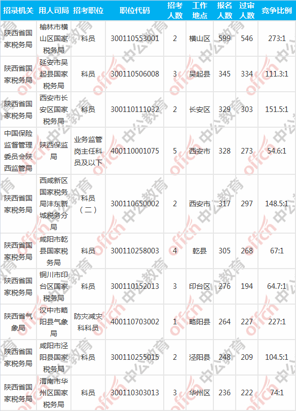 截至到4日9時,競爭比例的職位為陜西省榆林市橫山區國家稅務局科員一職,招錄2人,截至到4日9時報名人數為599人,通過審核人數為546人,競爭比例273:1!