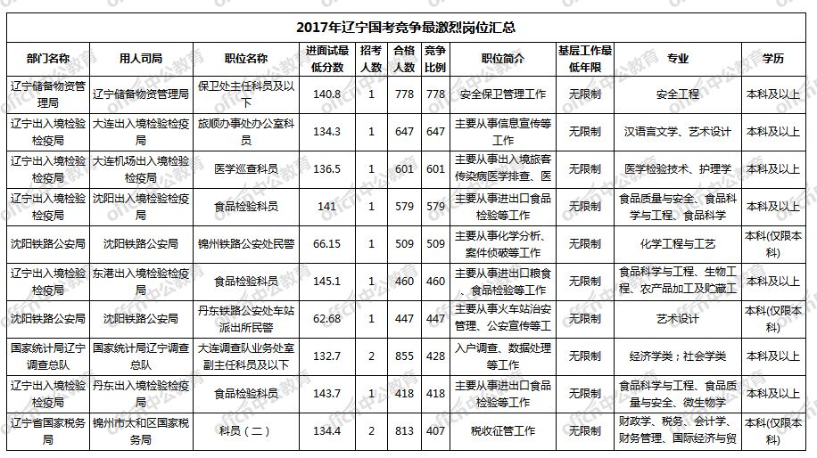 據遼寧中公教育統計,每年國考都會涌現出一批熱門職位,競爭力非常激烈,可謂萬里挑一。如2017國考的遼寧儲備物資管理局-保衛處主任科員及以下一職招錄1人,有778人報名(數據截至2016年10月24日17時30分),競爭比接近800:1,熱度可見一斑。