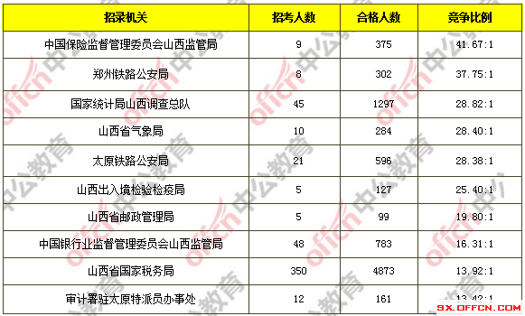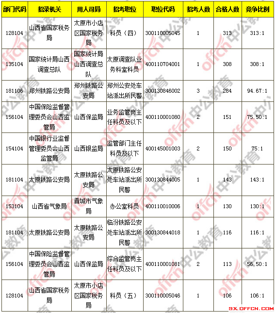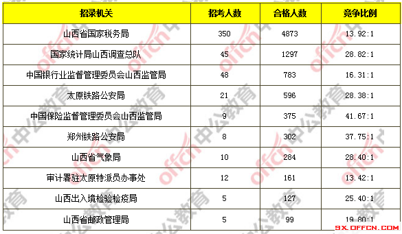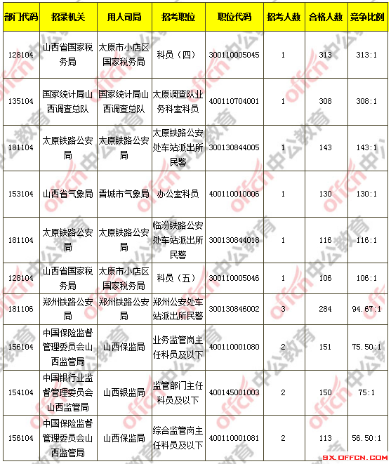 報名通過審核人數前十的職位主要集中在山西省國家稅務局、國家統計局山西調查總隊、鄭州鐵路公安局等部門,具體信息如下: