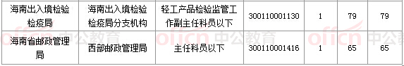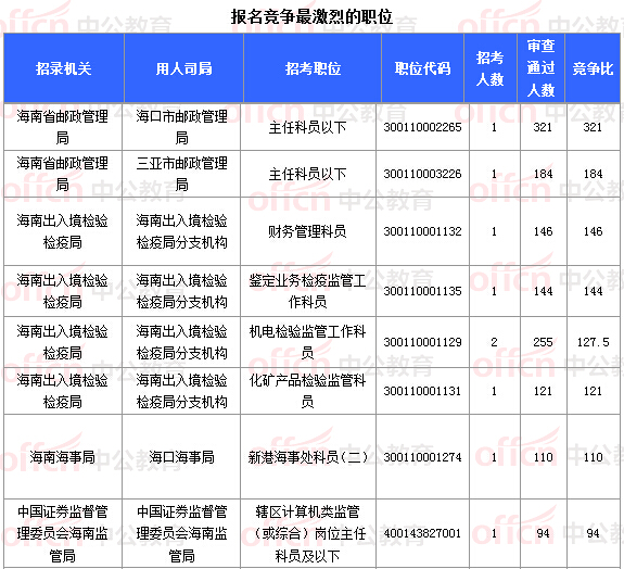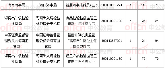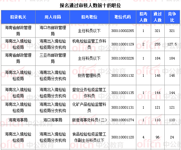 報(bào)名通過(guò)審核人數(shù)前十的職位主要集中在海南省郵政管理局、海南出入境檢驗(yàn)檢疫局、海南海事局等部門(mén),具體信息如下:
