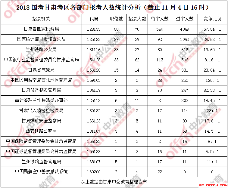 [11月4日16時]甘肅2018國考報名人數統計:過審7565人 最熱競爭比例489:1
