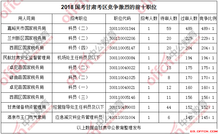 11月4日16時,競爭比例的職位為甘肅省國家稅務局嘉峪關市國家稅務局科員(二)一職,招錄1人,11月4日16時通過人數為489人,競爭比例為489:1!