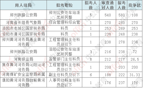報名通過審核人數前十的職位主要集中在鄭州鐵路公安局、河南省氣象局、河南省國家稅務局,具體信息如下: