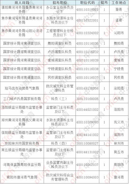 截止到11月4日16時,工作地點在河南的職位共有17個無人報考,占全部職位的2.51%,與昨天相比下降了0.49%。下面是無人報考職位一覽表,中公教育專家建議廣大考生多關(guān)注一些較冷職位,避免激烈競爭,結(jié)合自身條件,找到屬于自己的職位。