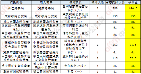 報名通過審核人數(shù)前十的職位主要集中在長江海事局、重慶市國家稅務局、中國證券監(jiān)督管理委員會重慶監(jiān)管局等部門,報名通過審核人數(shù)最多的職位亦是競爭比例的職位。報名通過人數(shù)位居第二的中國證券監(jiān)督管理委員會重慶監(jiān)管局的職位主要是從事從事轄區(qū)會計類監(jiān)管或內部綜合管理等工作,為特殊專業(yè)職位(證監(jiān)法律類)職位,共兩個職位,且皆不限政治面貌、基層工作最低年限、服務基層項目工作經(jīng)歷。而重慶市國家稅務局的職位最熱崗位的政治面貌、基層工作最低年限、服務基層項目工作經(jīng)歷皆不限。主要招錄2016年及以后年度畢業(yè)的高校畢業(yè)生,女性,在本單位最低服務年限為5年的考生。