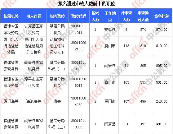 報名通過審核人數前十的職位主要集中在福建省國家稅務局、廈門出入境檢驗檢疫局、廈門海關,具體信息如下: