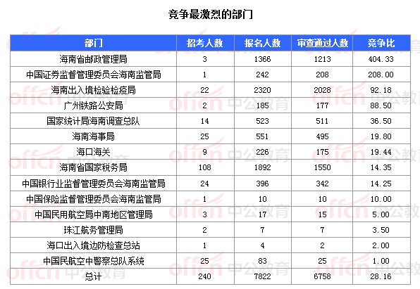 截至11月8日16時,據中公網校統計,國考職位中工作地點在海南的職位通過審核總人數為6758人,共有4個職位無人通過審核,其中還有部分待審核的人數高達1064人,平均競爭比例為28.16:1。