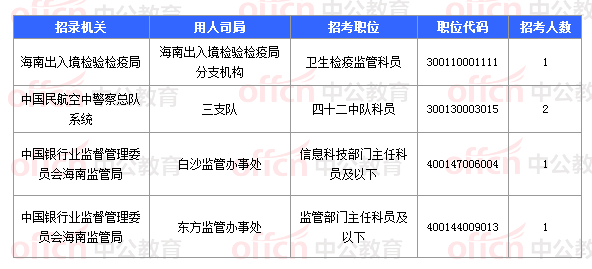 截止到8日16時,工作地點在海南的職位共有4個無人報考,占全部職位的2.44%。下面是無人報考職位一覽表,中公網校專家建議廣大考生多關注一些較冷職位,避免激烈競爭,結合自身條件,找到屬于自己的職位。