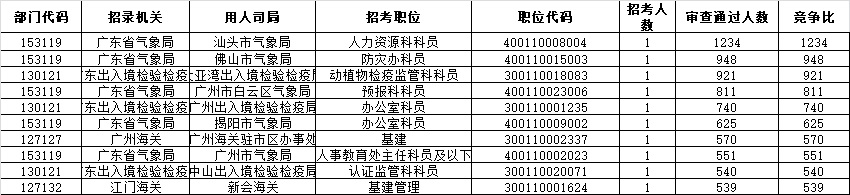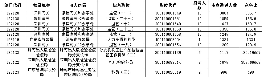 報名通過審核人數前十的職位主要集中在深圳海關、廣東省氣象局、珠海出入境檢驗檢疫局等部門,具體信息如下: