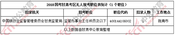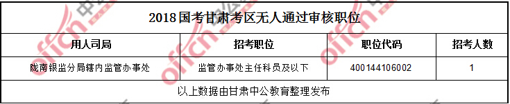 11月8日17:30,工作地點在甘肅的職位共有1個職位無人通過審核,占全部職位的0.5%,1個職位無人報考,占全部職位的0.5%。下面是無人待審及無人報報職位一覽表,中公網校專家建議廣大考生多關注一些較冷職位,避免激烈競爭,結合自身條件,找到屬于自己的職位。