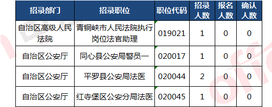 截止到31日10:00,無(wú)人報(bào)考職位:共有4個(gè)是:青銅峽市人民法院執(zhí)行崗位法官助理、同心縣公安局警員一、平羅縣公安局法醫(yī)、紅寺堡區(qū)公安分局法醫(yī)、。下面是無(wú)人報(bào)考職位一覽表,中公網(wǎng)校專(zhuān)家建議廣大考生多關(guān)注一些較冷職位,避免激烈競(jìng)爭(zhēng),結(jié)合自身?xiàng)l件,找到屬于自己的職位。