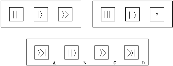 例題:下題給出兩套圖形,左套中的三個圖形在構成或變化上,具有某種特點或遵循某種規則。要求從下面四個選項中,選擇一個取代右套中的“?”,使右套圖形也具有與左套圖形相同或相似的構成特點或變化規則。